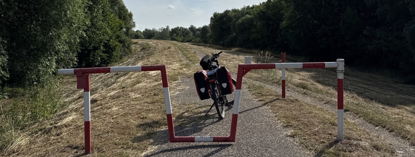 Also mache ich mich mit ihr auf den Weg. Sie fährt flotter als ich, wobei ich sie ein paar Jahre älter als mich schätze. Aber da vertut man sich ja leicht. Jedenfalls kennt sie sich aus. Sie kommt aus Freistadt, was kurz hinter der Grenze nach Österreich liegt. Für 16 Uhr ist ein Gewitter angesagt und sie will bis dahin zuhause sein. Ich bin eher besorgt, dass es in Žofín keinen Schlafplatz für mich gibt. „Das passt schon“, beruhigt mich Aloisa. Und wie sie das sagt, glaub ich es ihr sofort. Doch jetzt gilt es erst mal die Baustelle zu überwinden, die sich vor uns auftut. Ein riesiger Bauzaun versperrt den Weg. Dahinter klafft ein straßenbreites, tiefes und zehn Meter langes Loch in der Straße. Doch heute sorgt der Himmel für mich und lässt eine junge Radlerin von der anderen Seite des Bauzauns auf uns zukommen. „An der rechten Seite geht’s mit Schieben“, sagt sie. „Da ist es nicht so steil.“ Gesagt getan. Aloisia stellt sich auch hier geschickter an. Ich habe wieder mal Probleme mit dem Schiebegang, der bei dem bröckelnden Lehm-Steingemisch und dem Anstieg von Nöten ist, aber nicht anspringen will. Irgendwann tut er’s dann doch. Und ich kann Aloisias „Brauchst Hilfe?“ dankend ablehnen.
