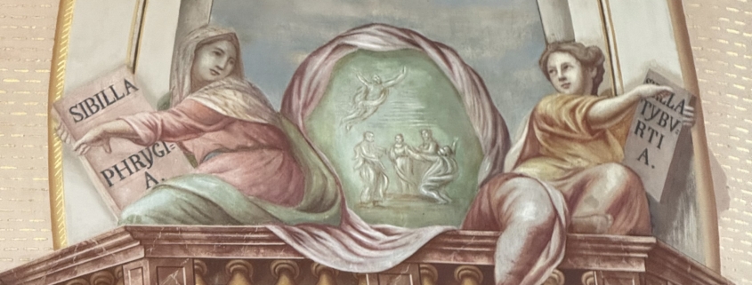 Als ich in Dobrá Voda ankomme, gehe ich natürlich wie letztes Jahr in die Wallfahrtskirche Maria Trost. Das muss jetzt schon sein! Sie ist zwar sehr Barock und golden, aber sie hat, wie gesagt, diesen schönen Himmel. Und unter diesen setze ich mich wieder in die Kirchenbank und schaue hoch. Und siehe da. Als ich dieses Mal hoch blicke, entdeckte ich in den Ecken, die den Himmel umrahmen, Frauen. Wie ungewöhnlich, sonst sind da doch in der Regel heilige Männer als stützendes Beiwerk. Und als ich genauer hinschaue, entdecke ich: Es sind Sibyllen! Na sowas! Acht von ihnen, je zwei an jeder Ecke. Die hatte ich letztes Jahr nicht gesehen. Eine kleine Gänsehaut überläuft mich. „Das hat ja schon was Mystisches“, denke ich. „Das kann kein Zufall sein.“ Ich sollte offenbar noch mal hierher kommen. Ganz ehrfürchtig sitze ich nach diesem Sibyllentreff noch eine Weile in der Kirchenbank.